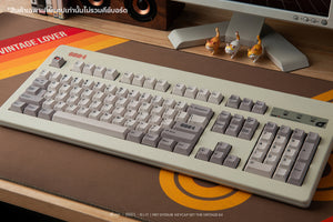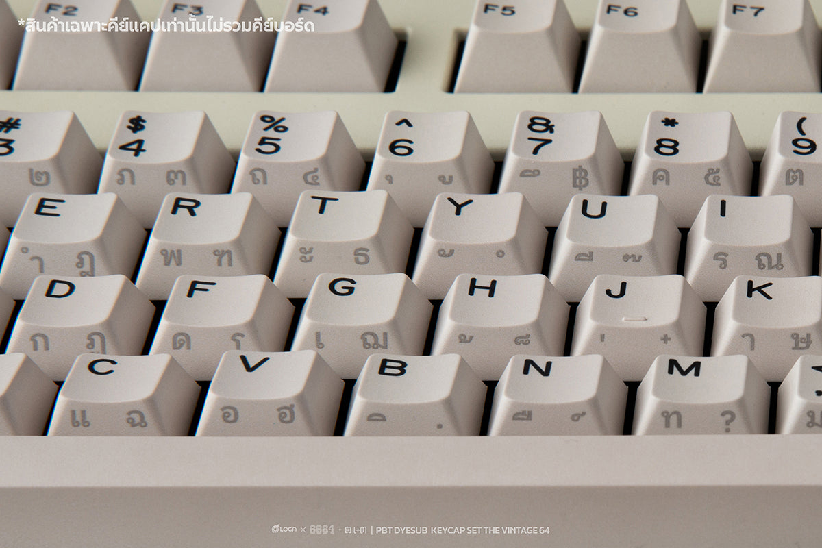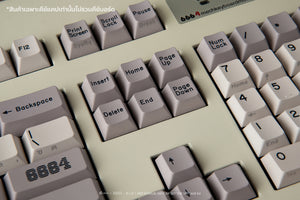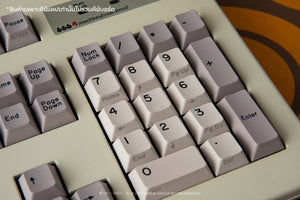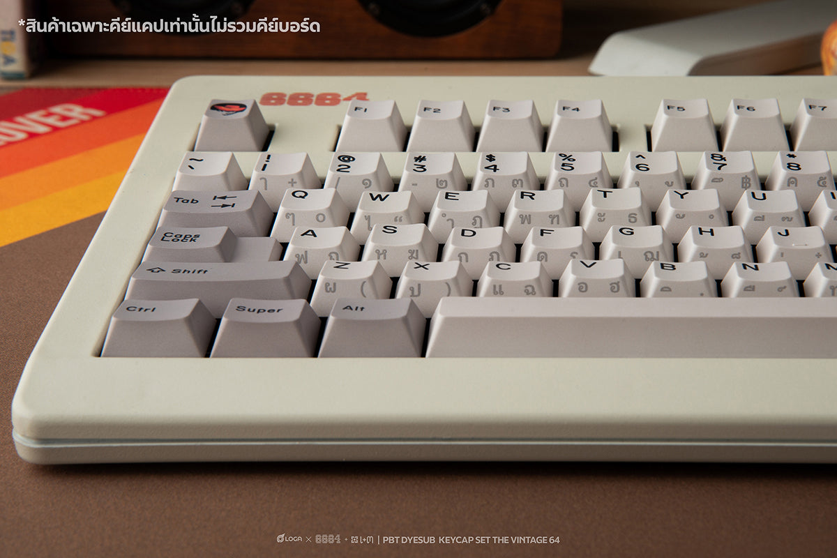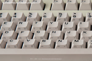The keycaps are PBT DYESUB, featuring a Cherry Profile and a classic color scheme inspired by the 1980s keyboard era in Thailand. Back then, when computers first came to the country, keyboards didn't have Thai letters printed on them. Instead, users relied on stickers placed on the side of the keycaps to get Thai fonts.